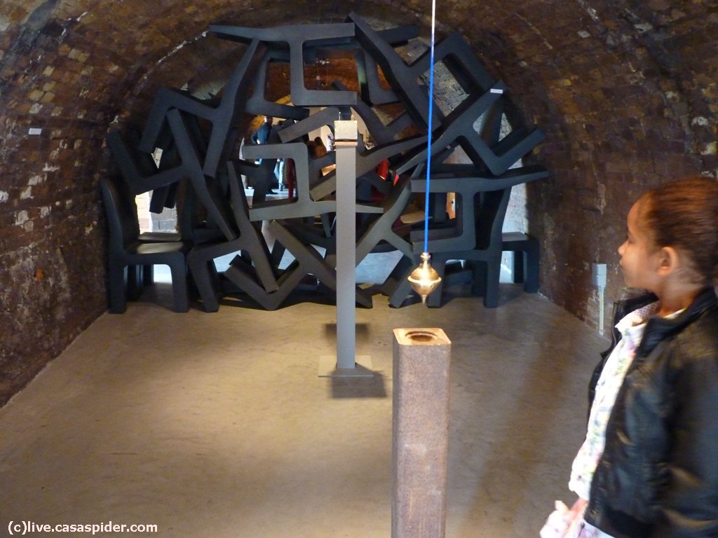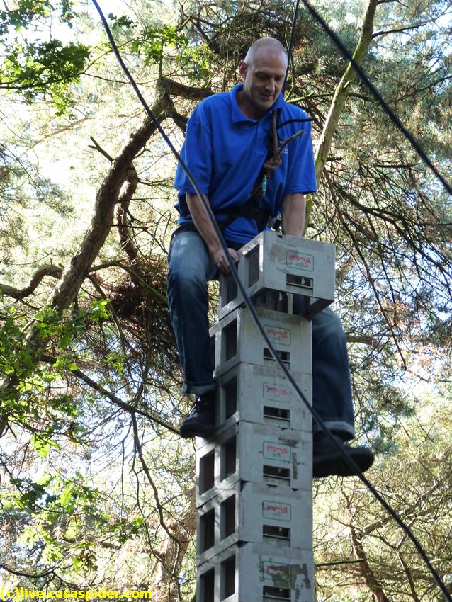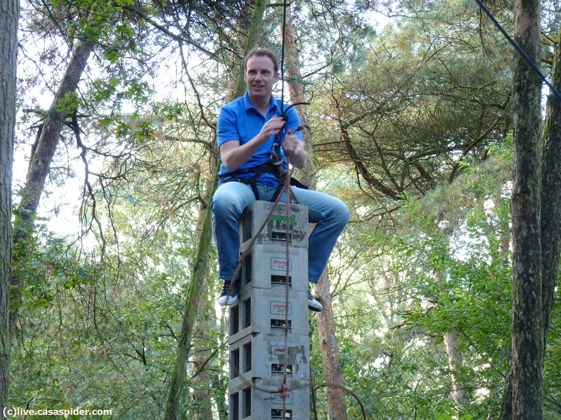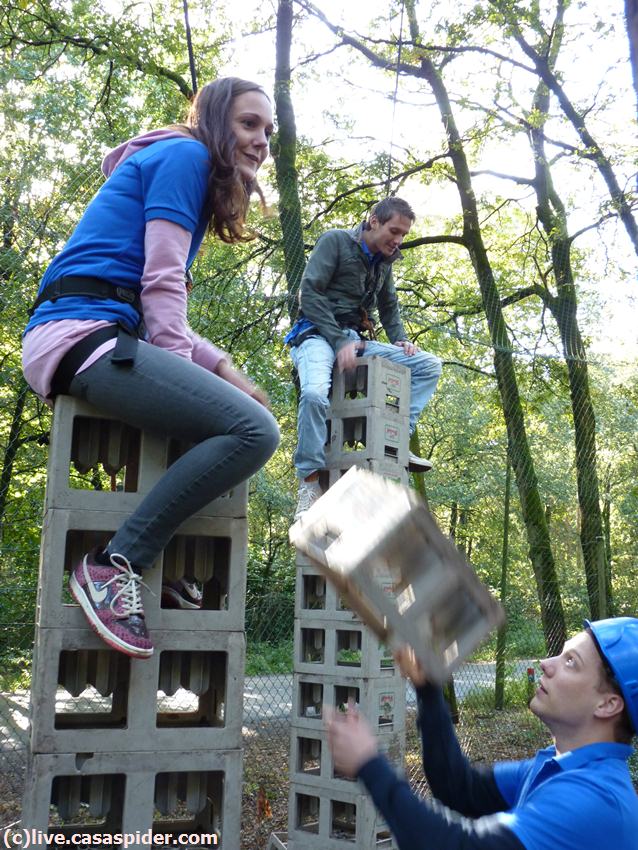 Na een korte pauze stond het stapelen van bierkratten op het programma. Aanvankelijk dacht ik hierbij aan het stapelen van bierkratten: je pakt er één, zet er een andere op en bij acht ofzo houdt het op. Helaas, hier was het de bedoeling dat iemand op de kratten ging zitten, een ander iemand telkens een nieuwe krat aangaf en de krattenzitter zelf een toren bouwde.