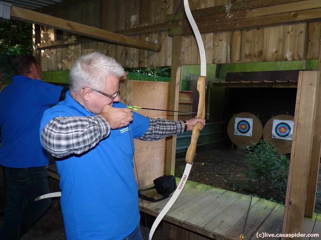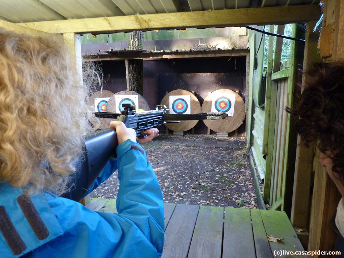Het laatste onderdeel voor ons was het schieten met luchtbuks, luchtpistool, kruisboog (ook Edy) en handboog. Lekker afwisselend. Een zekere Frans legde de werking van de diverse wapens uit. "Richt alleen op de kaartjes en draai je nooit om richting de andere mensen. Voor je het weet schiet je iemand in zijn been. Gelukkig woont er aan de overkant een dokter, maar dat is wel een dierenarts. En die haalt de kogel er zonder verdoving uit." Vast een herkenbaar verhaal voor eenieder die uitleg van Frans heeft gehad.